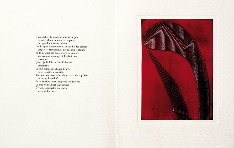 Edition originale – 1988 – 32.5 x 25 cm – 18ff. en neuf feuillets doubles. Couverture imprimée en noir et rouge, rehaussée d’une empreinte à sec. Cinq gravures en couleurs de Marc Pessin pour les exemplaires numérotés de 1 à 50 et cinq gravures estampées à sec pour les exemplaires suivants (51-75).