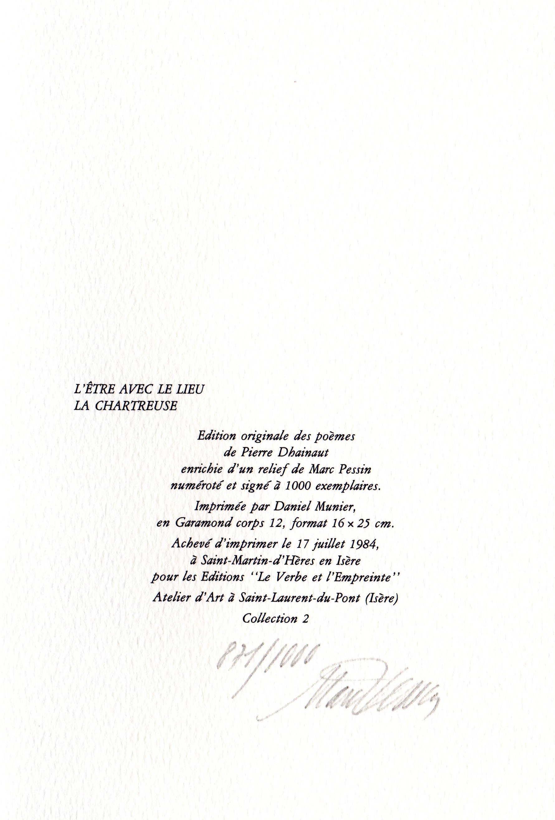 Cela fait dix ans que le poète vient se ressourcer en Chartreuse – de laquelle il écrit « à chaque retour, c’est le commencement, c’est aussi bien la permanence »- lorsqu’en 1977 il rencontre Marc Pessin. C’est dans l’atelier-galerie de l’artiste, lieu « qui respire un équilibre à la fois géographique et architectural », que Pierre Dhainaut assistera chaque après-midi au tirage des gravures, moments qu’il décrit comme une « joie irremplaçable. » Une cinquantaine d’ouvrages naîtront, fruit d’une collaboration où le poète et l’artiste « s’accorderont autour d’un même renoncement à la trace personnelle. »