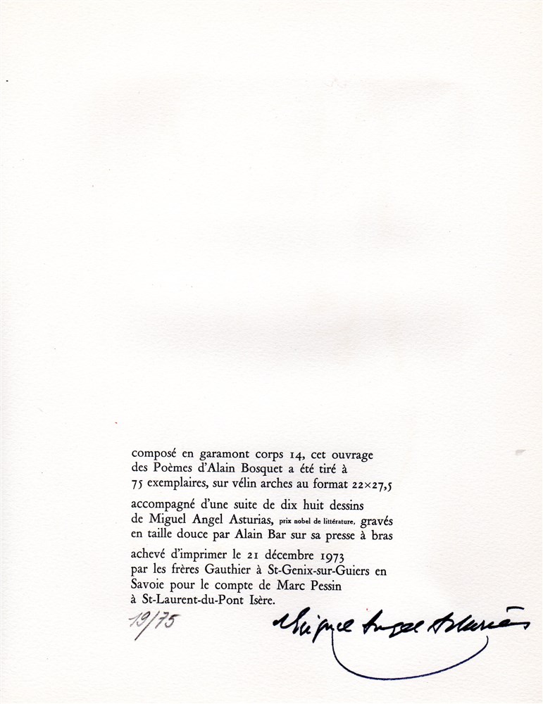 Composé en garamond corps 14, cet ouvrage des Poèmes d’Alain Bosquet a été tiré à 75 exemplaires, sur Vélin Arches au format 22 x 27.5 accompagné d’une suite de dix huit dessins de Miguel Angel Asturias, (prix Nobel de littérature) gravés en taille douce par Alain Bar sur sa presse à bras.
