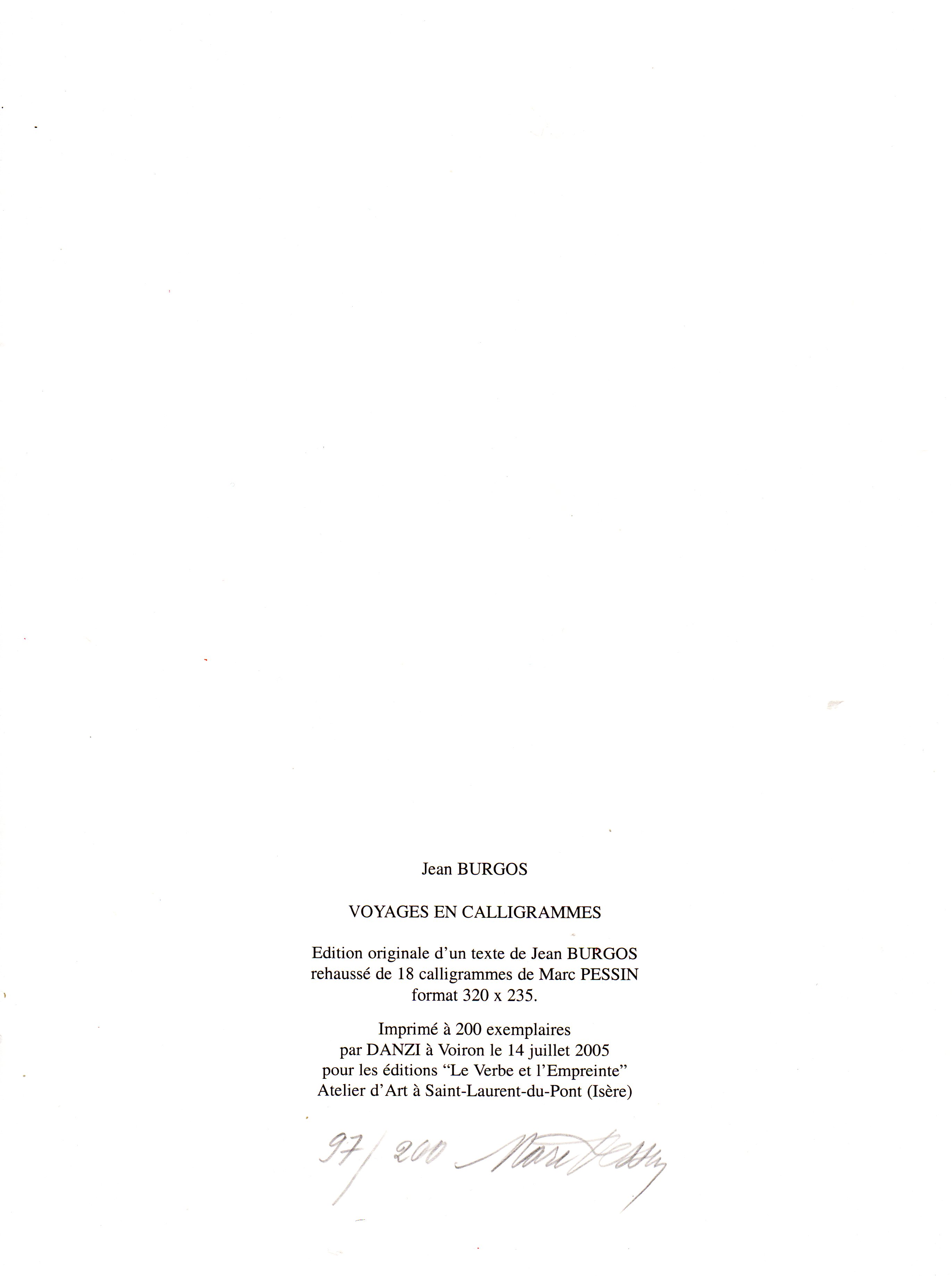 Achevé d’imprimer par Danzi à Voiron en avril 2009 pour les éditions « Le Verbe et l’Empreinte » atelier d’art à Saint-Laurent-du-Pont (Isère)
