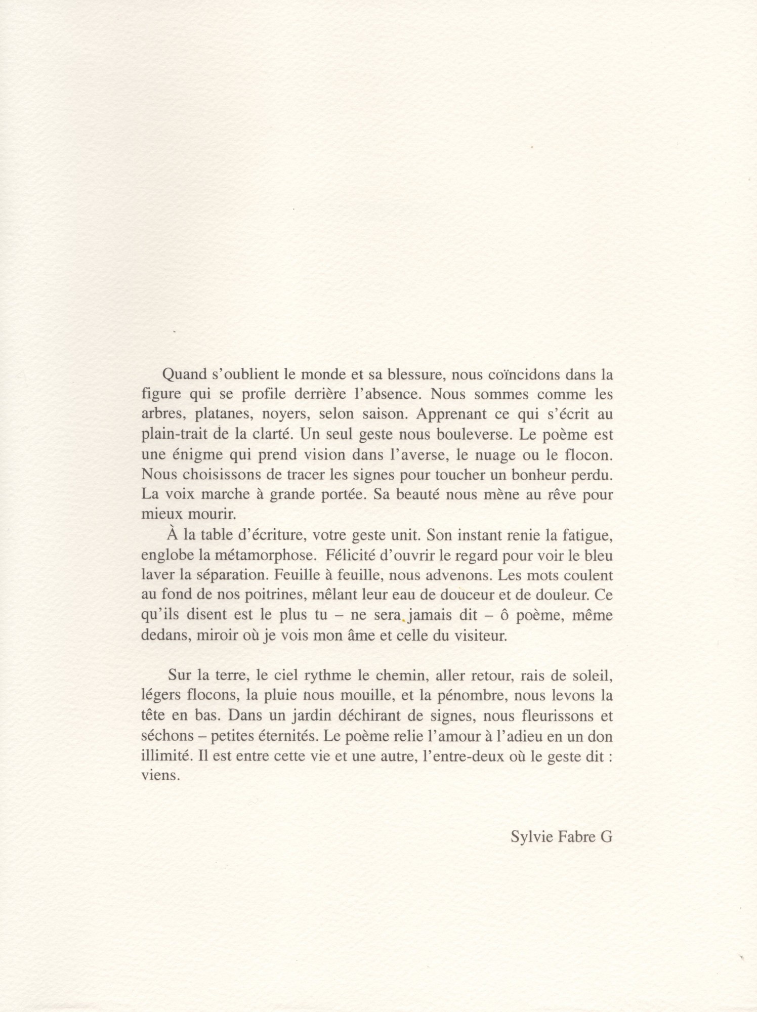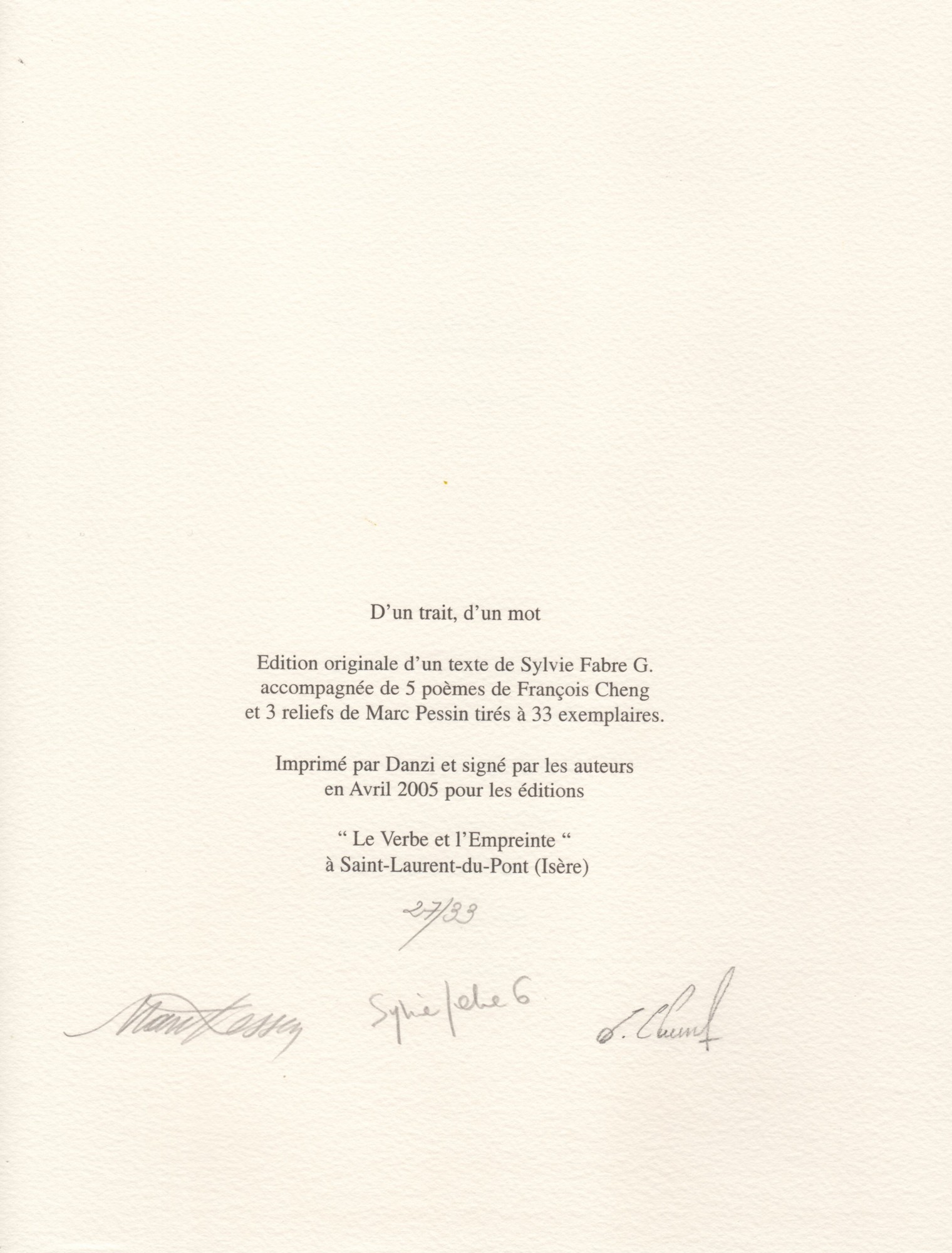 Edition originale d’un texte de Sylvie fabre G. accompagnée de 5 poèmes de François Cheng et 3 reliefs de Marc Pessin tirés à 33 exemplaires. Reliure de Anne Bossenbroek. Imprimé par Danzi et signé par les auteurs en avril 2005 pour les éditions « Le Verbe et l’Empreinte » à Saint-Laurent-du-Pont (Isère)