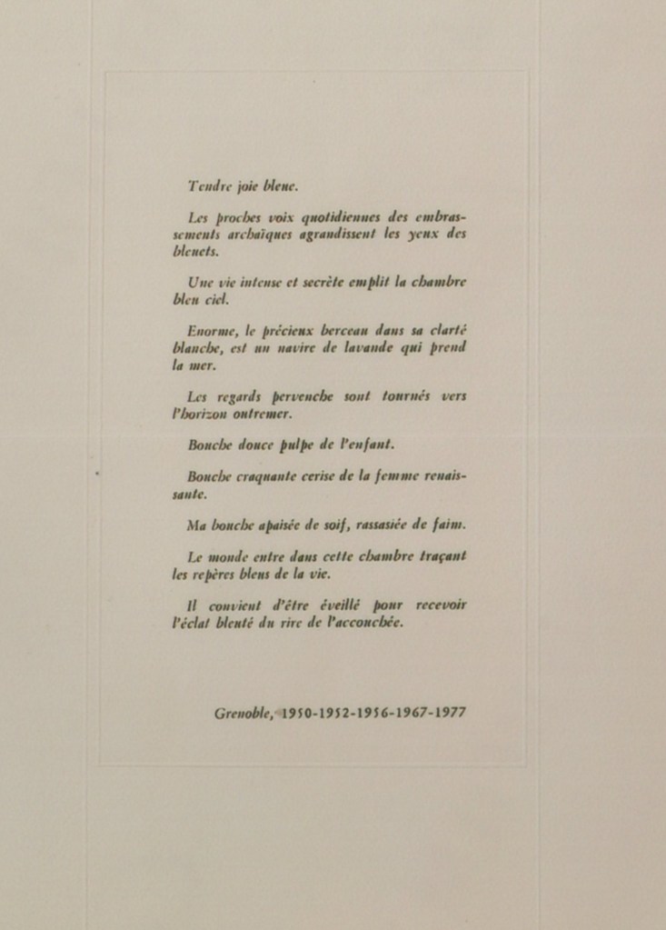 Manuscrit original calligraphié par l’auteur sur vélin d’Arches estampé à sec – Noël 1975.