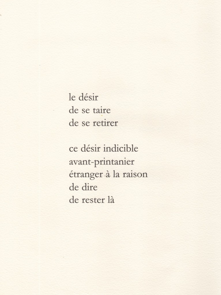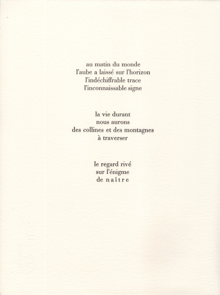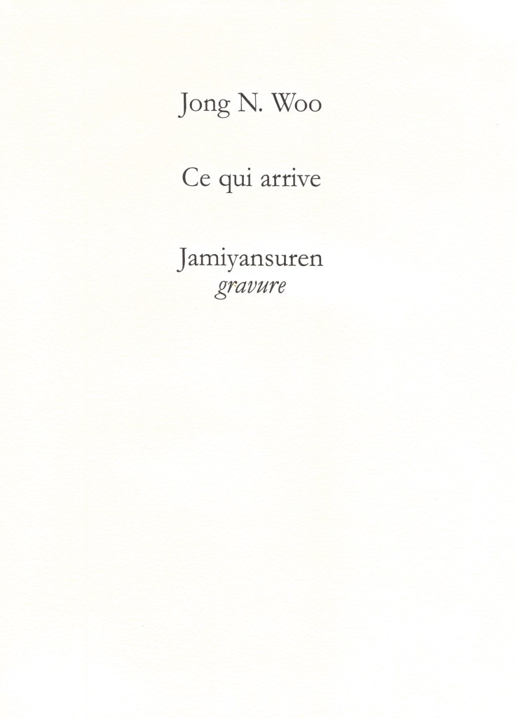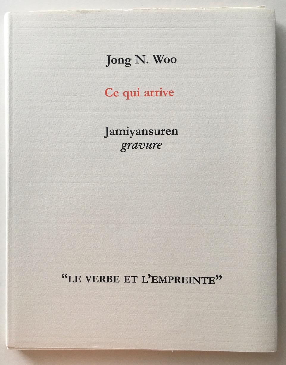 Edition originale des poèmes de Jong N.Woo composés en garamond corps 32 accompagnés de trois calligraphies de Jamiyansuren gravées par Marc Pessin et tirées sur sa presse à Saint-Laurent-du-Pont (Isère). Achevé d’imprimer à 33 exemplaires en octobre 2012 par danzi à Voiron pour les éditions « Le Verbe et l’Empreinte ».