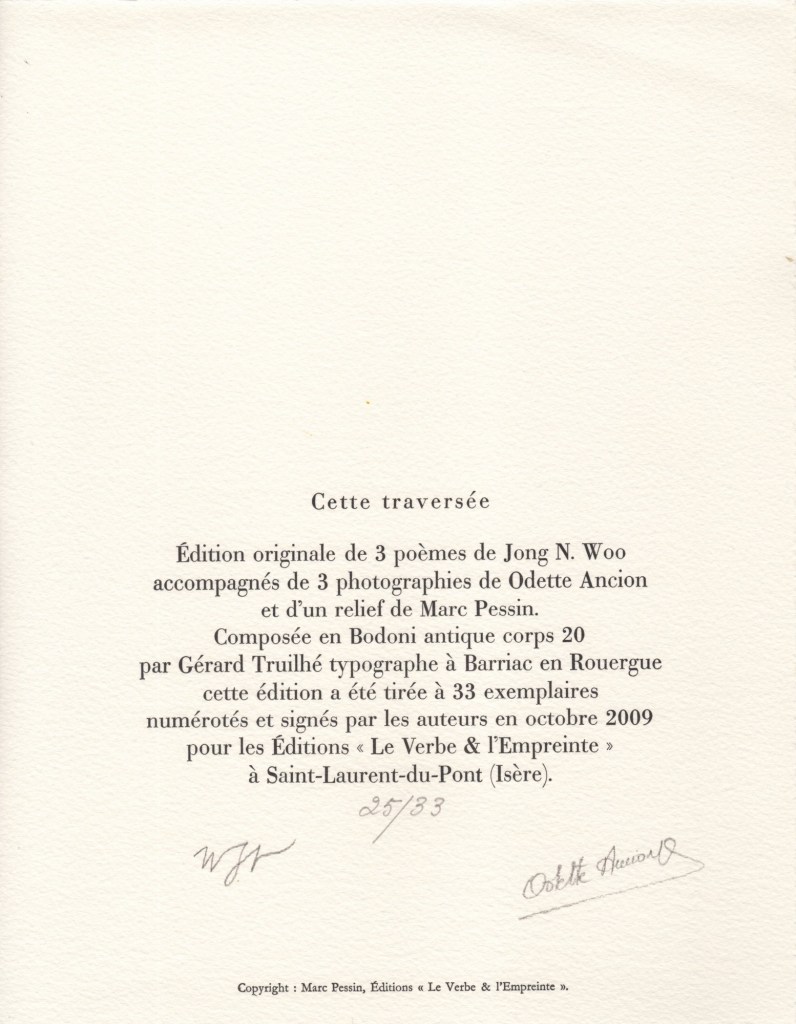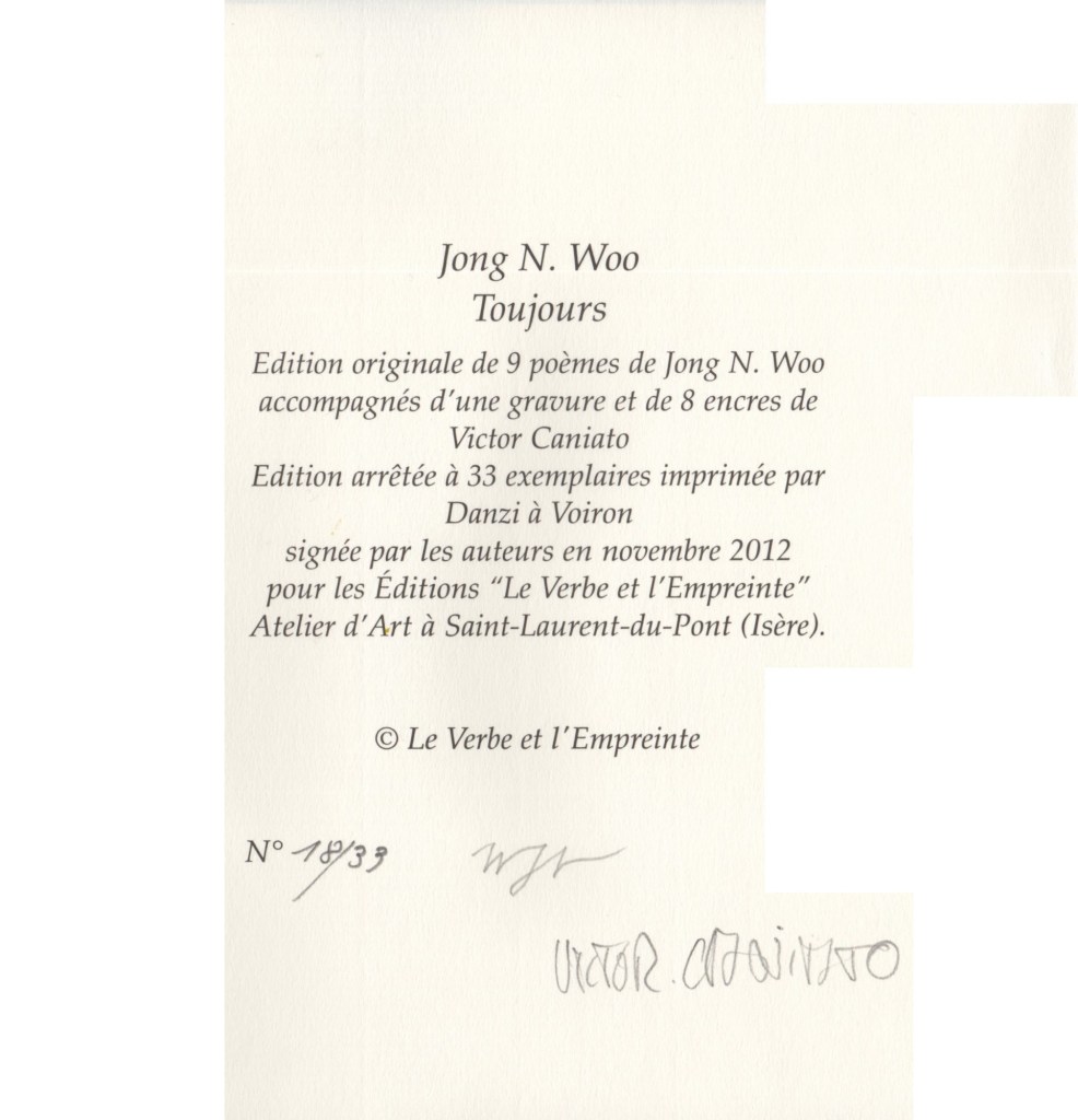 Edition originale de 9 poèmes de Jong N.Woo accompagnés d’une gravure et de 8 encres de Vitor Caniato. Edition arrêtée à 33 exemplaires imprimée par Danzi à Voiron, signée par les auteurs en novembre 2012 pour les Editions « Le Verbe et l’Empreinte ». Atelier d’Art à Saint-Laurent-du-Pont (Isère).