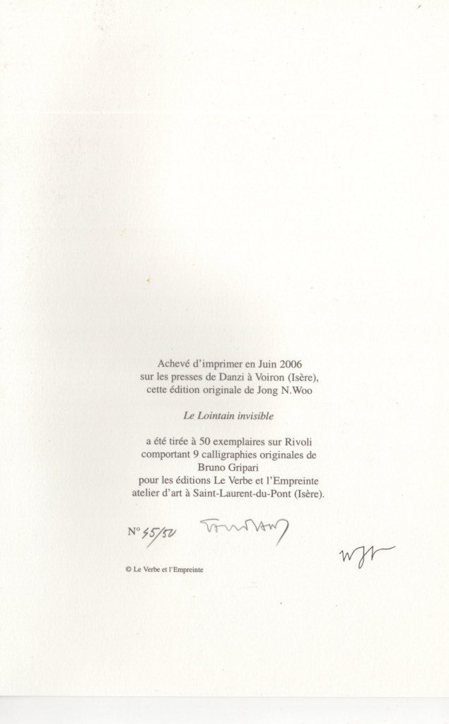 Achevé d’imprimer en juin 2006 sur les presses de Danzi à Voiron (Isère), cette édition originale de Jong N.Woo « Le lointain invisible » a été tirée à 50 exemplaires sur Rivoli comportant 9 calligraphies originales de Bruno Gripari pour les éditions Le Verbe et l’Empreinte, atelier d’art à Saint-Laurent-du-Pont (Isère).