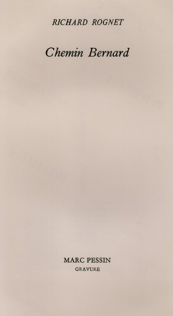 Achevée d’imprimer en mai 1995 sur les presses de Jean-Jacques Sergent typographe à Cléry-Saint-André, cette édition originale de Richard Rognet Chemin Bernard composée en Plantin italique de corps 12 a été tirée à 50 exemplaires sur Vélin d’Arches comportant 6 gravures originales signées de Marc Pessin, tirées par lui sur sa presse à Saint-Laurent-du-Pont (Isère), pour les Editions Le Verbe et l’Empreinte et l’O.N.C.I.A.L.E.