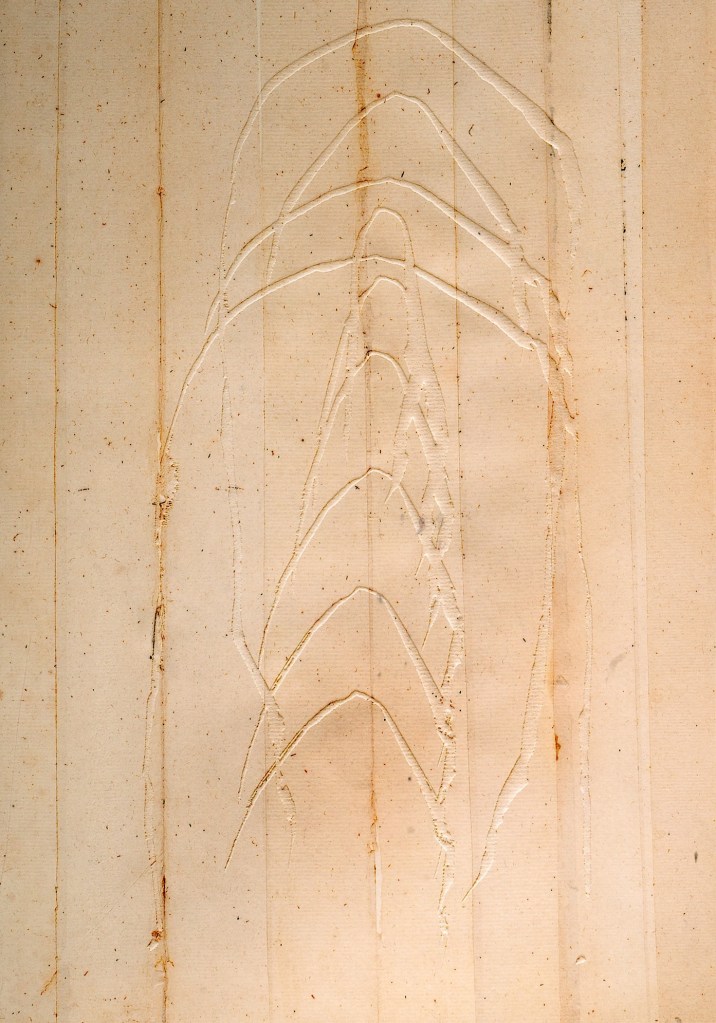 Edition d’un texte de Régis Roux rehaussée de 15 gravures originales de Marc Pessin tirées sur Vélin Arches teinté feuille à feuille format 460 x 165. Imprimée à 100 exemplaires par Danzi à Voiron et signée par les auteurs. Achevé en décembre 2001. Bibliothèque des Charbinières – Centre d’archéologie imaginaire – Saint-Laurent-du-Pont (Isère).