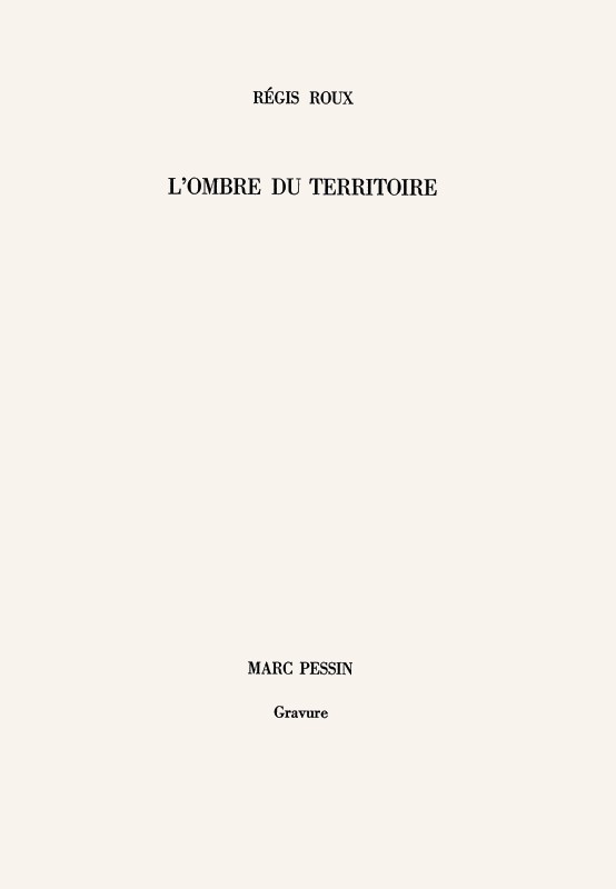 Achevée d’imprimer le 22 février 2000 sur les presses de Jean-Jacques Sergent, typographe à Cléry-Saint-André, cette édition originale des poèmes de régis Roux L’OMBRE DU TERRITOIRE composée en bodoni de corps 18, a été tirée à 55 exemplaires sur Vélin d’Arches comportant 4 gravures originales signées de Marc Pessin, et tirées par lui sur sa presse pour les Editions « Le verbe et l’Empreinte » à Saint-Laurent-du-Pont (Isère)