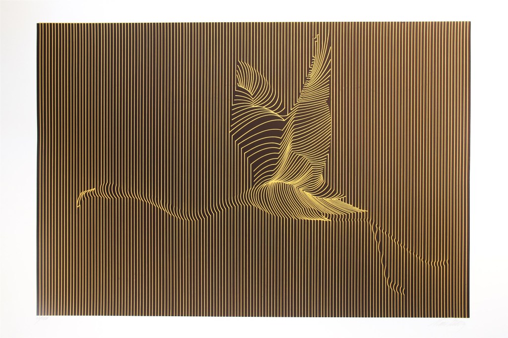 Les sérigraphies originales réalisées par Marc Pessin basées sur la thématique des « oiseaux », participent, en utilisant la géométrie harmonieuse du trait, d’une étude stylisée des mouvements propres aux volatiles. Cette vision, fondée sur les lois et principes du mouvement permettant l’envol et le dépassement des limites spatio-temporelles, rend perceptible les invisibles déplacements oscillatoires de l’air.